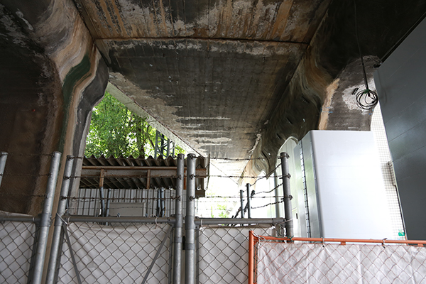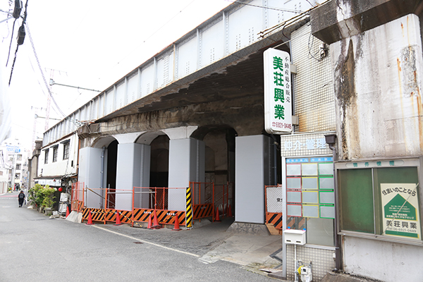 鉄道遺構は桜ノ宮駅周辺に複数ありますが、その中でも有名なものとして「京阪電鉄乗越橋」が挙げられます。桜ノ宮駅の東口を降りて北側に出ると、コンクリートの擁壁が続く中に突然、斜めに橋脚が入り込んだ箇所が見えます。これこそ、「京阪電鉄乗越橋」です。なぜ、桜ノ宮駅に京阪電車なのか。京阪電車は隣の京橋駅では?と思われますが、これは京阪電車が梅田への乗り入れを計画していた名残なのです。
