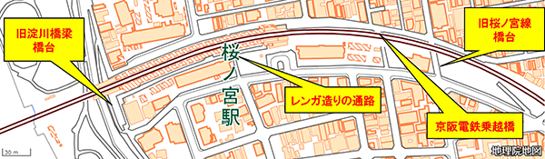 今回取り上げた鉄道遺構の場所。ちなみに駅の南側の土地には現在はマンションなどが立ち並ぶが、明治時代からの桜ノ宮駅の盛土が残っていた。