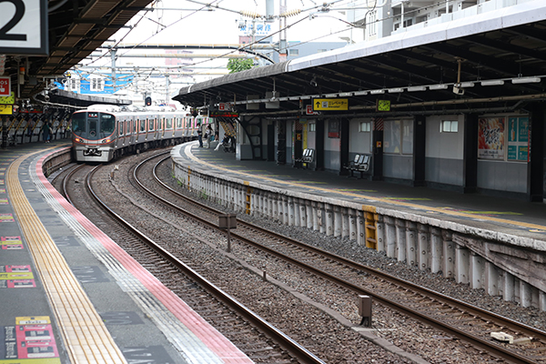 6 桜ノ宮駅のホーム。内回りホームの下を見るとかつてのホームのスロープが見える。 【この画像の記事に戻る】 100年以上前の「歴史」が眠る駅!?大都市大阪に今も眠る明治期の鉄道遺構を辿ってみた! 前の画像 次の画像
