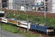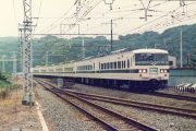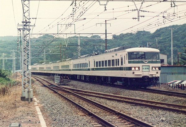 東急車輛製185系200番代の新製試運転。0番代とは対照的な緑帯でデビューした。 ’82.6 横須賀線 東逗子~田浦 P:はまかいじ (185系思い出ギャラリーより)