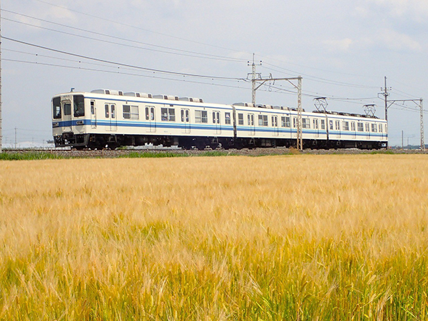 ●収穫時期間近になった麦畑の中を走り抜ける、東武850型です。