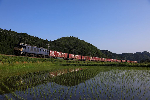 ●「山男」 であるロクヨンセン国鉄型電機が、フル満載の貨物列車を牽引して田園地帯を通り過ぎた。