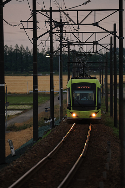 ●夕闇迫る2本の軌条を切れ長の双眼で輝かせ、「FUKURAM」が坂道をスパートしてきました。