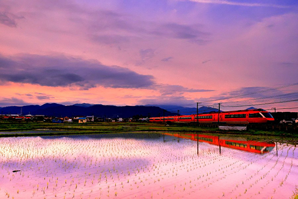 ●田植えが終えたばかりの水田の中をローズバーミリオンの車体を映して駆け抜けるGSEロマンスカー。