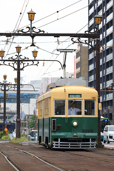 ●豊橋駅をバックに、駅前大通りを進むモ3203。懐かしい昭和カラーが令和にタイムリープしてきました。
