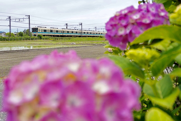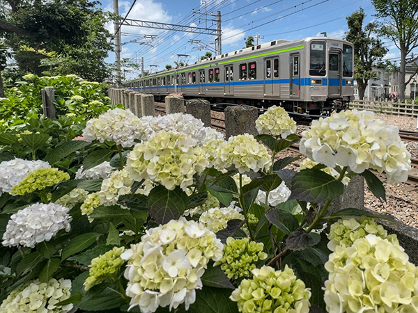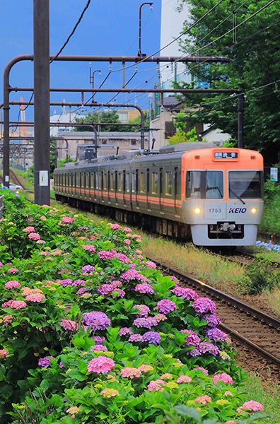 ●梅雨空の中、紫陽花が彩る散歩道をゆく京王井の頭線