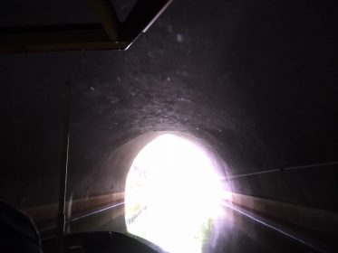 ▲諸羽トンネルと第2トンネルの間は距離が長く、右に左にカーブしながら進む。森林に囲まれた緑の中を進む場所も多く、心落ち着く眺めだ。船からは分かりにくいが、高台を通っている。
