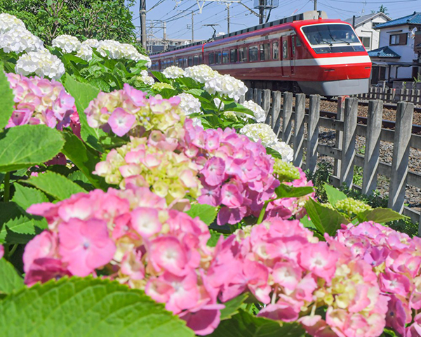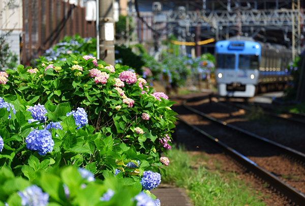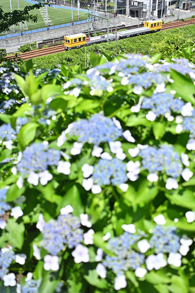 ●線路沿いの紫陽花と「りょうもう」リバイバルカラー。