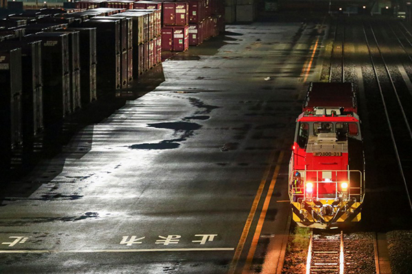●日の出前、静寂の青の世界をゆく貨物列車。