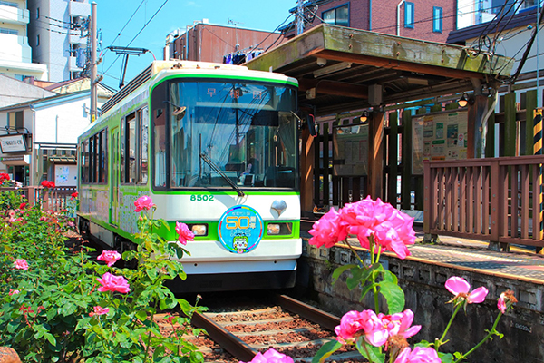 ●つかの間の晴れ空の下、薔薇が咲く三ノ輪橋で発車の時を待つ荒川線50周年記念号。