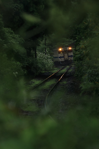 ●梅雨入りし、生い茂る緑の中に単行列車がやってきました。