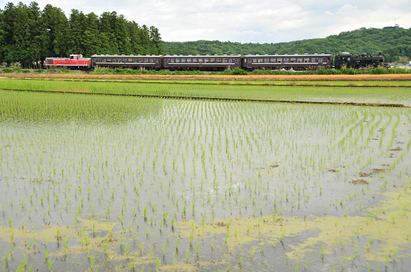 ●稲穂が伸びてきた田んぼを補機のDE10を引き連れて「SLもおか」号がゆっくり通り過ぎていきました。