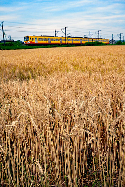 ●小麦が実り、黄金色の絨毯を黄色の列車が走って行きました。