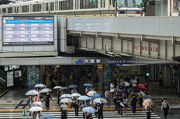 ●梅雨入りした途端、連日の大雨。大阪駅前で傘をさし、足早に横断歩道を渡る人々。