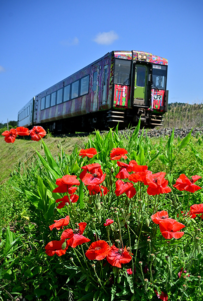 ●青空の下、赤いポピーと赤い「ラッピング列車」がコラボしました。