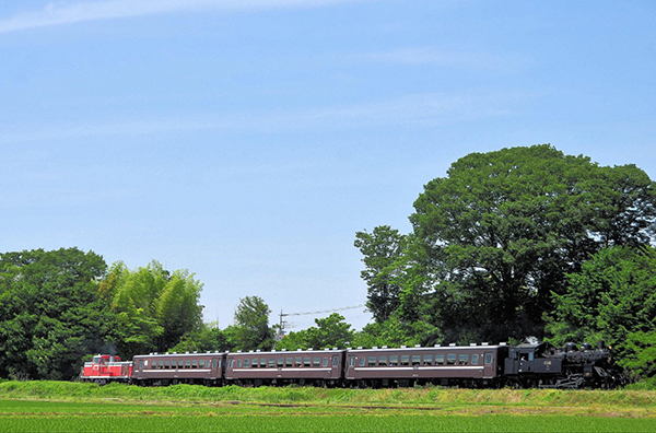 ●青空の下、「SLもおか」号が補機にDE10を引き連れて駆け抜けていきました。