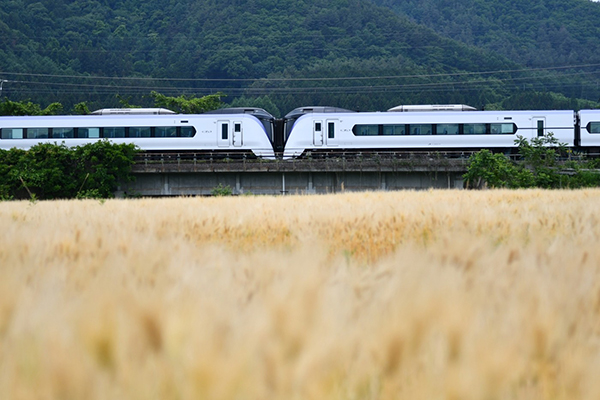 ●麦秋を取り込んで、26M E353系 「あずさ26号」の付属編成との連結部が鉄橋の上に乗り撮影です。