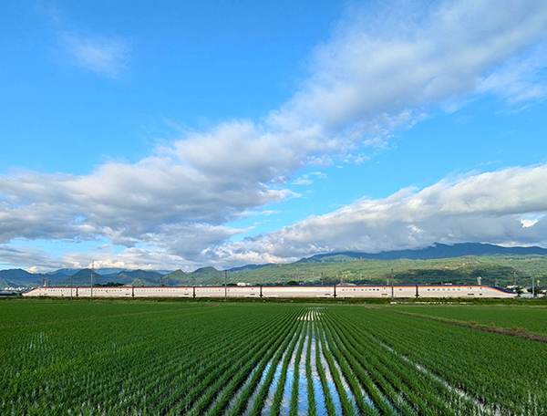 ●グリーンカーペットの間を走り抜けるE8系「つばさ」号。