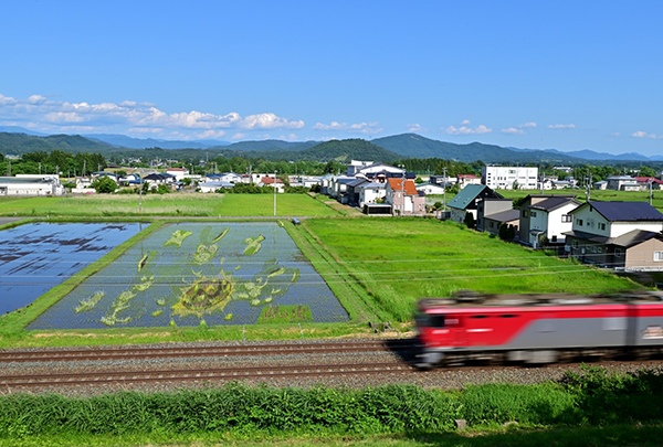 ●田んぼアート「貝の火」の前を金太郎貨物列車が風のように駆け抜けました。