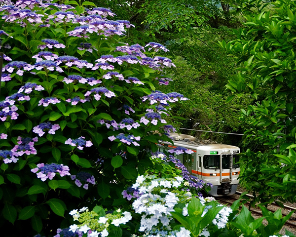 ●小雨降る中、見頃を迎えたガクアジサイが線路を見下ろしています。