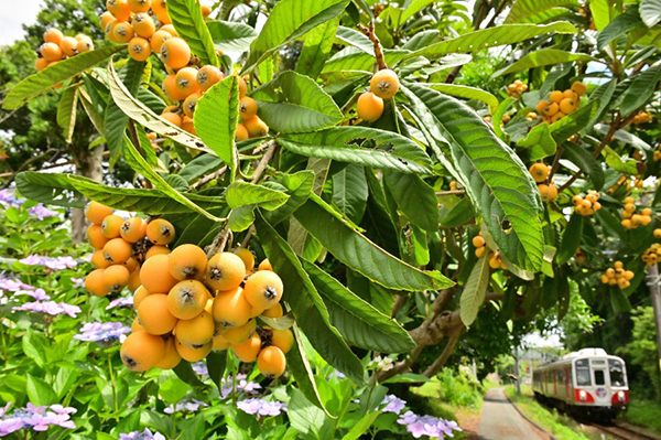 ●線路端の大輪のアジサイには目もくれず、まっすぐ前を見て走る「幸運の招き猫電車」。