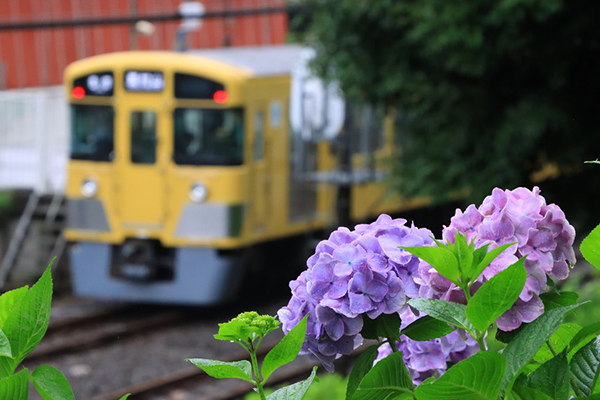 ●雨上がりの朝。しっとりとした雰囲気のなか紫陽花の美しさに見惚れていると黄色い西武が入線してきました。画面がパッと晴れやかになりました。