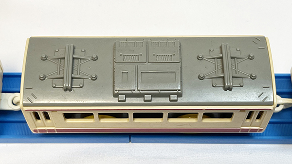 クーラーキセの日立製「FTUR-375-203A」も忠実に再現。似たような形であれば車種を跨いで流用されることもあるパーツだが、この形の採用例は「レッドアロー号」のみに留まる。