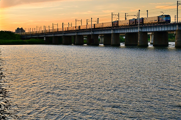 ●この時期限定撮影、早朝の馬入川を行く「スーパーレールカーゴ」。