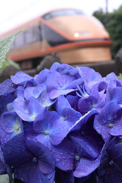 ●雨粒の付く紫陽花と、日光詣の「スペーシア」。