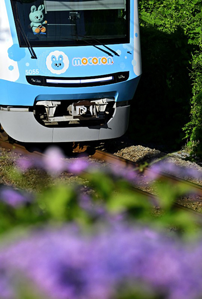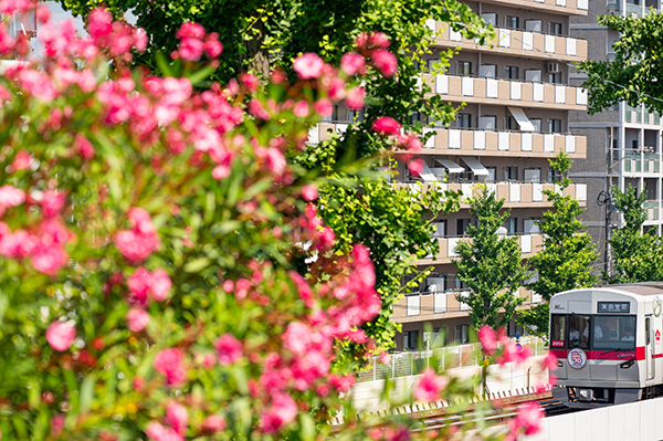 ●キョウチクトウが色を添える猛暑の街並みを、EXPO’70ラッピング列車が走り抜ける。1970年はこんなに暑かった?