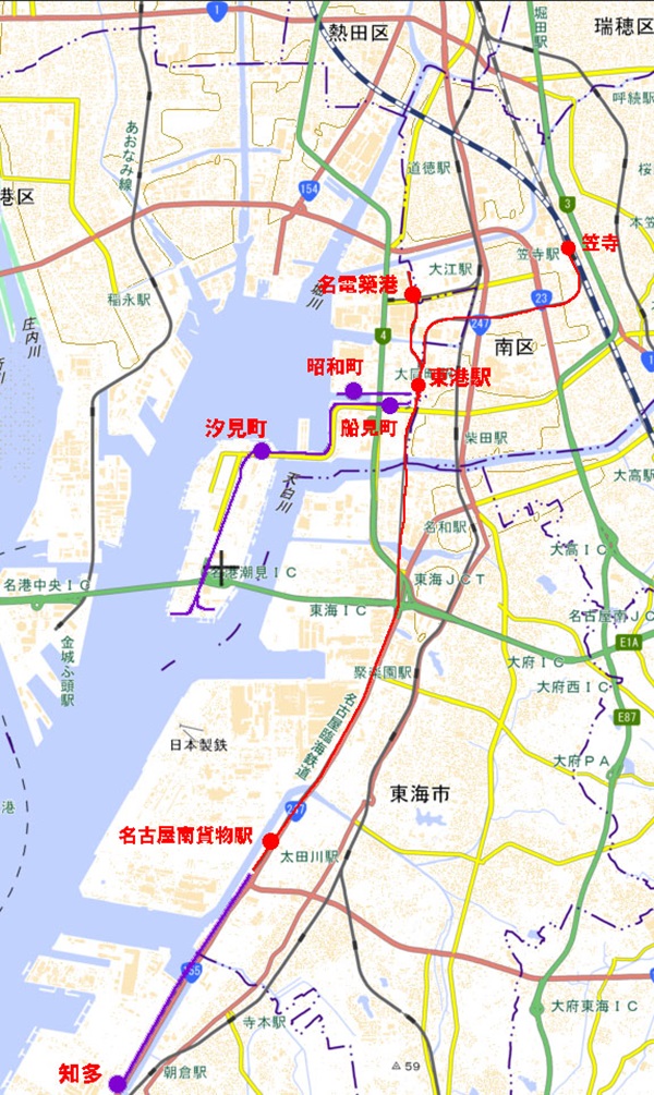 ▲名古屋臨海鉄道路線図(紫色は休止区間)。国土地理院図に上書き。