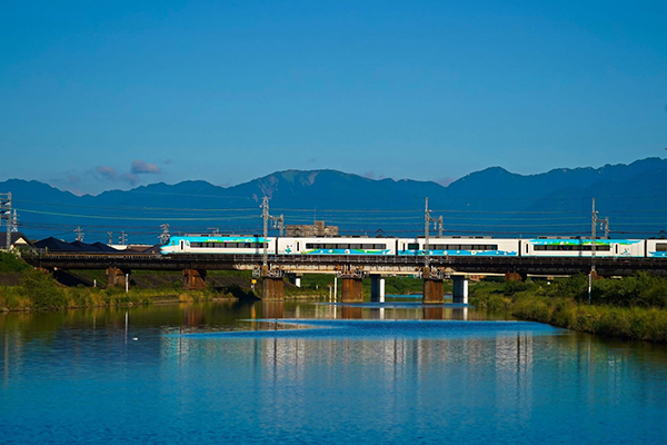 ●海蔵川を渡り、名古屋に向かうラッピング特急「ミジュマルライナー」。