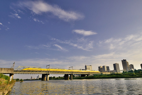 ●武蔵小杉のビル群を抜けた上り「ドクターイエロー」が夕日に照らされながら多摩川を渡りました。