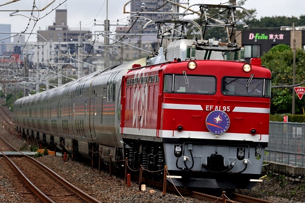 EF81 95は1982年に富山第二機関区から直接田端機関区へやってきた機関車です。国鉄最末期であった1987年3月に当時活躍していたジョイフルトレイン「スーパーエクスプレスレインボー」の指定機となり、カラーリングも客車に合わせた赤と白(裾部に黒のラインも入る)の地色に、大きな「EF81」の文字をあしらった派手なカラーリングになりました。