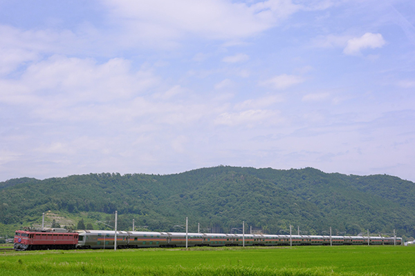 ●緑豊かな田園風景に、緩やかな弧を描く「カシオペア紀行」上野行き(最終列車)。5色のラインをまとったE26系の編成美を焼き付けました。