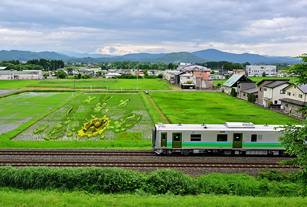 ●田んぼアート「貝の火」の前を「HB-E220」が駆け抜けました。