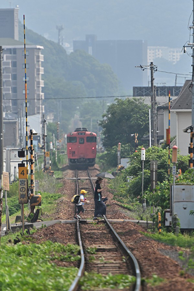 ●炎天下で陽炎が立つ中を広島行きのキハ47が通り過ぎた後、踏切を渡る親子も暑そうです