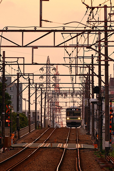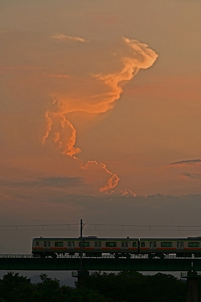 ●地上は梅雨明けがまだなのに、空はもう夏。夕映えの入道雲の下を、上り電車が通り過ぎて行きました。