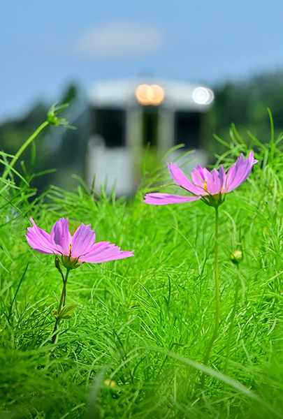 ●コスモスに歓迎され「気動車」が駆け抜けてきました。