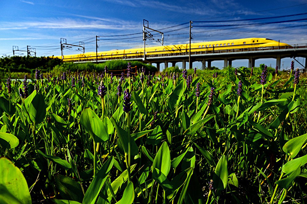 ●梅雨明けを思わせる夏空と水辺に咲くポンテデリアに「ドクターイエロー」が一瞬で通過して行きました。