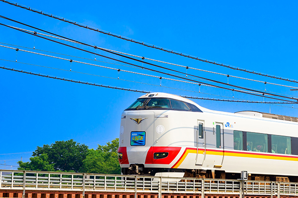 ●朝から厳しい暑さ、「スーパーくろしお」のデザインをまとったラッピング列車が白浜に向かう。