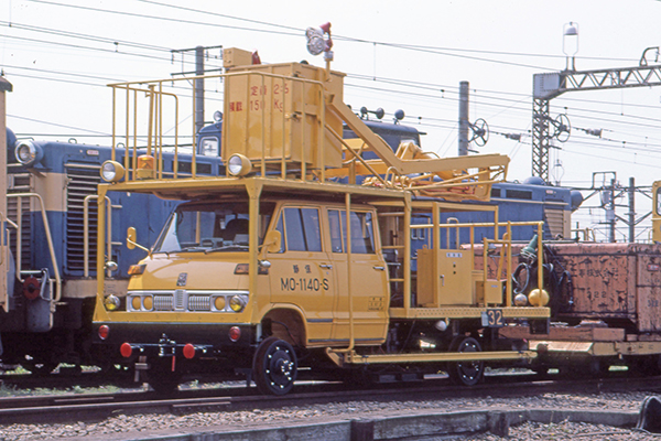 「静保MO-1140-S」と標記されています。外観から種車は当時でも希少車だったダイハツ・初代デルタ2tトラックなのがわかります。後部席もあるダブルキャブというのが更に希少です。デルタはダイハツがトヨタの系列下のもとダイナの兄弟車として作られ、シャシーはダイナと共通でした。しかしフロントグリル廻りは同じ時代の三菱キャンターに似た雰囲気を持ちつつ、フロントガラス下部からせり出す正面形状はまさしくダイナを思わせる作りでした。保線車としても、2tトラックの記録としても貴重な記録と言えるでしょう。