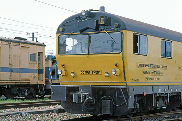 スペノのレール削正車の正面には「DO NOT SHUNT」(入換禁止?)の注記や車体側面にはメーカーや製造工場の大きなプレートが入るほか、国鉄時代に納入されたため「JAPANESE NATIONAL RAILWAYS」と国鉄を表すプレートがペンキで消されているのが判る。