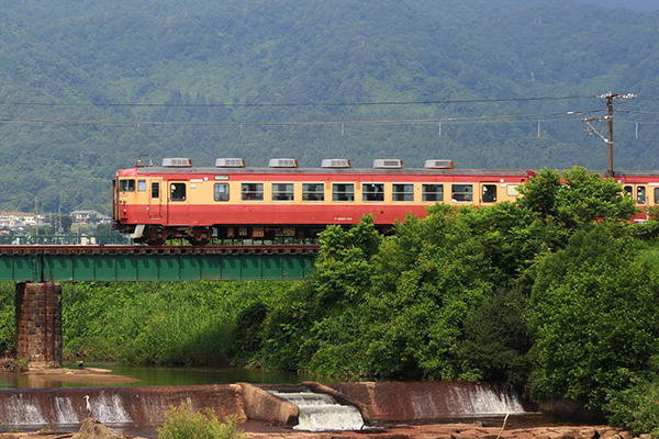 ●強烈な日差しで蒸し暑い朝、小さな橋梁を渡った列車が少し涼しげな横顔を見せた。