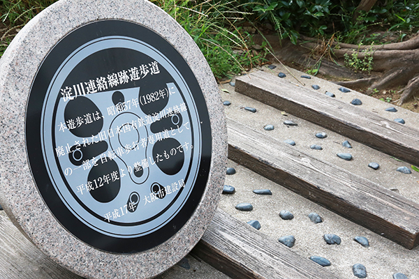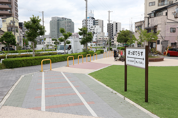 ▲廃線跡に設けられた公園には線路をかたどったタイルと駅名版を模した看板が設けられていた。