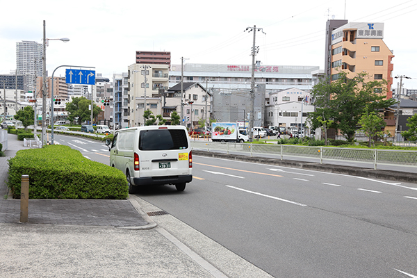 ▲京橋方面を望むと緩くカーブしている。