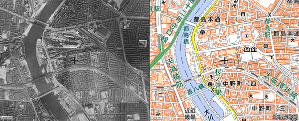 ▲1936(昭和11)年~1942(昭和17)年ごろの航空写真と現在の地図。引用元:国土地理院撮影の空中写真・国土地理院発行地理院タイル(標準地図)