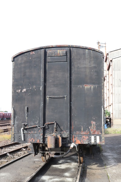 ▲ワ1の車端部妻面を見る。1925年以前の製造の車両ではネジ式連結器時代の名残で端梁にバッファーの差し込み穴が開いているものだが、この車両では木造車体から鋼製車体に更新する際に端梁廻りも改造されてしまったようだ。