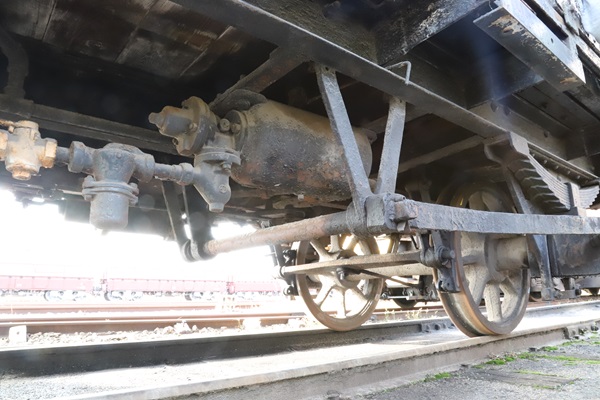 ▲ワ1の床下。車輪はスポーク車輪で、板バネの懸架はリンクなどなしにシューを介して直接台枠に懸架される。
