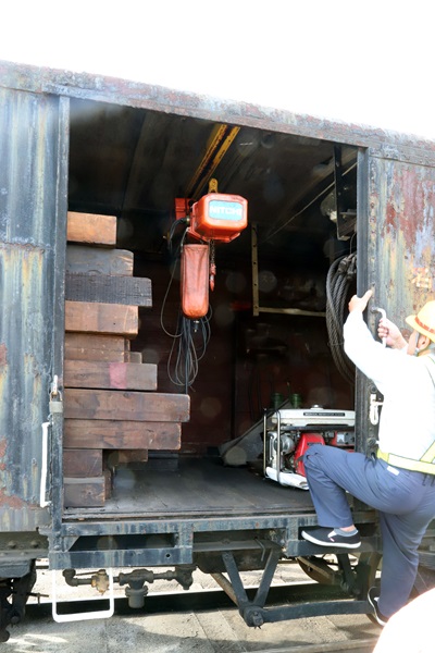 さて、名古屋臨海鉄道のワ1は、日々どんな活躍をしているのか。流石に100年以上の前の貨車が何百トンという貨物編成の間につながって貨物を運んでいるわけではなく、事故時に緊急出動するための機材を載せた救援車という車両になっているのである。名古屋臨海鉄道さんでの見学ツアーのおり、その中身を見学できたので紹介しよう。